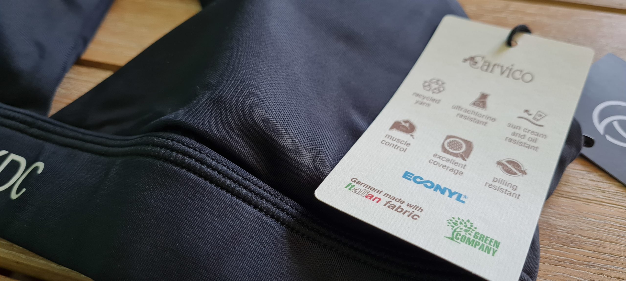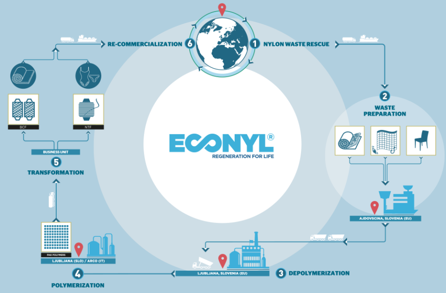 L’Econyl® est un type de nylon de haute qualité fabriqué entièrement à partir de déchets ramassés dans les océans (principalement des «filets fantômes» et tapis abandonnés). Ils sont triés et lavés, broyés, fondus puis transformés en fibre et tissés. La fabrication de cette fibre réduit de 80% les émissions de gaz à effet de serre par rapport à la production d’un fil de nylon standard. Elle n’utilise pas de matière fossile non renouvelable et est 100% recyclable à vie.